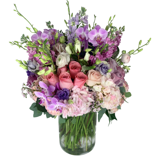 Soft, sophisticated, and effortlessly romantic, Blushing Elegance is a stunning arrangement of delicate and vibrant pinks mixed with purple and blooms. Featuring lush roses, elegant orchids, and airy hydrangeas, this bouquet radiates warmth, love, and refined beauty. Perfect for celebrating love, expressing gratitude, or adding a touch of elegance to any space, this arrangement embodies the charm of soft pastels and graceful florals. Whether it’s for a special occasion or just because, Blushing Elegance is sure to leave a lasting impression. **Colors are subject to availability.