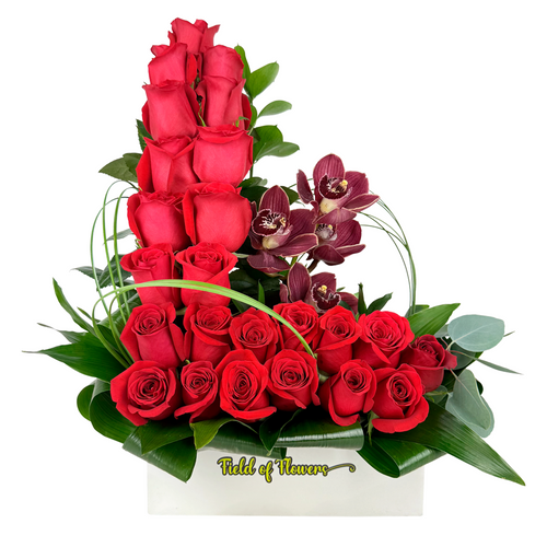 A true symbol of love and elegance, the Crimson Ladder arrangement features a striking cascade of deep red roses, artfully arranged to create a ladder effect, reminiscent of a delicate ladder of petals. Each luxurious rose is hand-selected for its velvety texture and rich, vibrant hue, creating a visually stunning and romantic display. Designed to make a statement, the Crimson Ladder is perfect for weddings, anniversaries, or any occasion where you want to express deep admiration and passion. The downward flow of roses creates a graceful, eye-catching visual that adds drama and sophistication to any space. **Flowers are subject to availability.