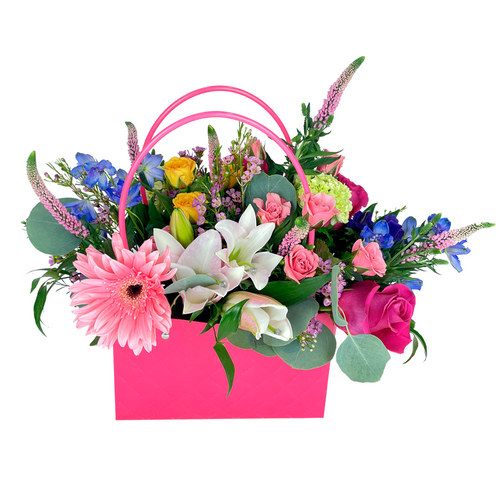 Say hello to the most fashionable flowers in town! This garden arrangement comes in a pink handbag-style vase, because who says flowers can’t accessorize? Perfect for the flower lover with a flair for style, this arrangement is here to make a statement—because sometimes, your blooms just need a handbag of their own! Carry on, chic gardener! *Hand bag color varies *Colors are subject to availability. Approximately: 12″ H X 9″ W