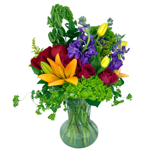 Too colorful? Never heard of her. This burst of blooms is unapologetically cheerful and exactly what Fridays were made for. Give it, get it, and let the weekend begin—with flowers leading the charge. *Colors are subject to availability. Approximately 21″ H x 13″ W