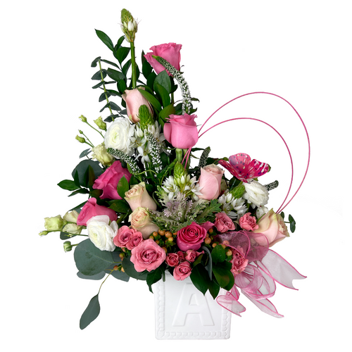 Welcome the arrival of a precious baby girl with the Petal Princess arrangement, a heartwarming bouquet of soft pink, fresh green, and pristine white flowers. This charming design beautifully combines the gentle hues of pink and white roses, and delicate greenery, creating an elegant and refreshing look that celebrates new beginnings. Tied with a sweet bow detail, this arrangement adds an extra touch of love and care, making it the perfect way to welcome a little one into the world. The soft pink blooms symbolize love and sweetness, while the green accents represent growth and fresh starts, all wrapped up in the purity of white. **Flowers are subject to availability. APPROXIMATELY: 20″H X 11″ W