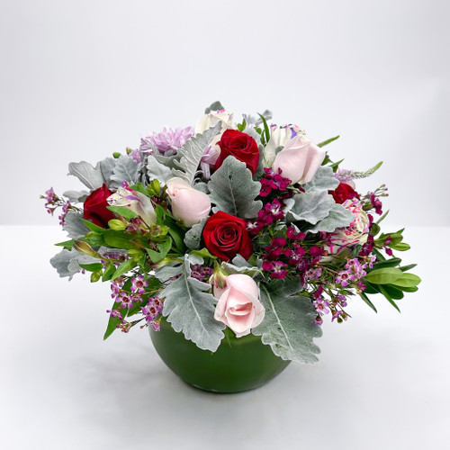 Each arrangement is hand-crafted by a skilled designer and is unique. The one pictured is only an example. The designer making yours will use the most beautiful, freshest flowers available to achieve an arrangement like the one pictured in appearance, size, and value. Click here to learn more about our guarantee! Approximately : 12″ H x 11″ L